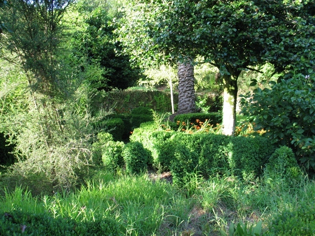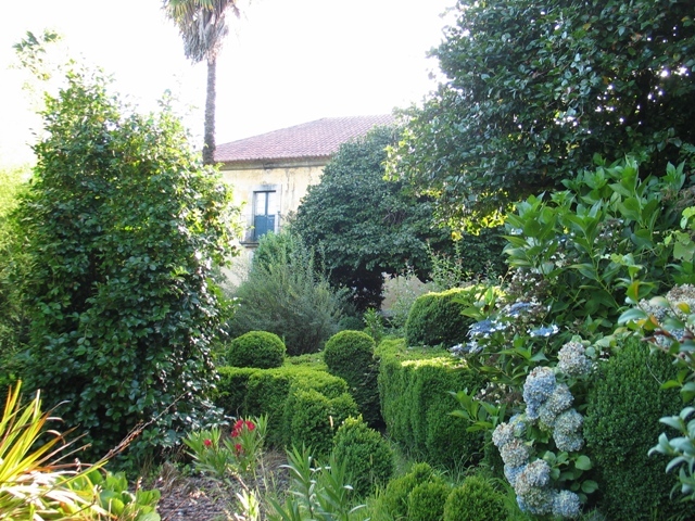 O jardim surge a Nascente do corpo principal do edifício, numa área organizada em socalcos delimitados por muros de pedra de granito. O jardim ocupa um socalco intermédio, estando os outros destinados à produção agrícola, e tem características formais marcadas pela presença de sebes de buxo anão que formam motivos aparentemente geométricos. Contudo, o desenho não é totalmente perceptível devido à falta de manutenção, mas a sua integridade parece não estar grandemente afectada. Se o desenho exibiu alguma simetria, não é evidente à primeira vista. Os canteiros de buxo rodeiam sobretudo as camélias ou os locais prováveis de maciços de vegetação sub-arbustiva. Não há indícios de que o jardim seja contemporâneo à casa, revelando-se, antes, bastante provável que seja significativamente posterior à fundação da propriedade. Muito provavelmente terá sido construído numa das últimas intervenções, no final do século XIX ou inícios do século XX seguindo a moda de construção dos jardins de buxo que marcou a paisagem das Terras de Basto. É possível, avaliando o porte actual das camélias, que estas tivessem sido plantadas por essa ocasião.