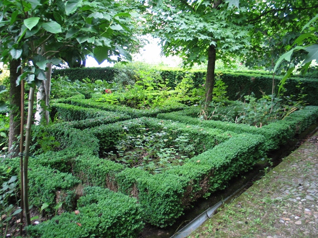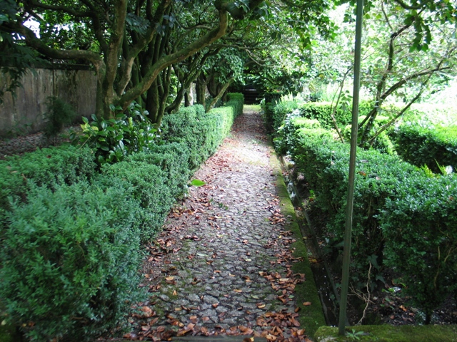 O jardim do patamar inferior é o de maiores dimensões. É um jardim marcado em quase toda a sua extensão pela geometria regular dos canteiros de buxo, caminhos, muros e levadas de água. Interiormente, os canteiros de buxo, arbóreo e anão, estão plantados com vegetação variada, como agapantos, roseiras, jarros, evónimos. De referir ainda o coberto arbóreo denso de camélias de médio e grande porte e outras árvores plantadas mais recentemente. Algumas levadas acompanham os caminhos de laje ou de calçada irregular de granito. Aliás, a água é um elemento abundante neste espaço. Um dos limites do jardim, pelo lado sudoeste, é feito por um muro de pedra de granito interrompido, de forma compassada, por namoradeiras.