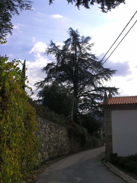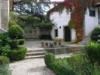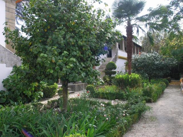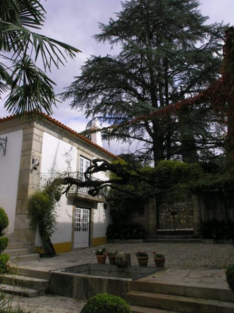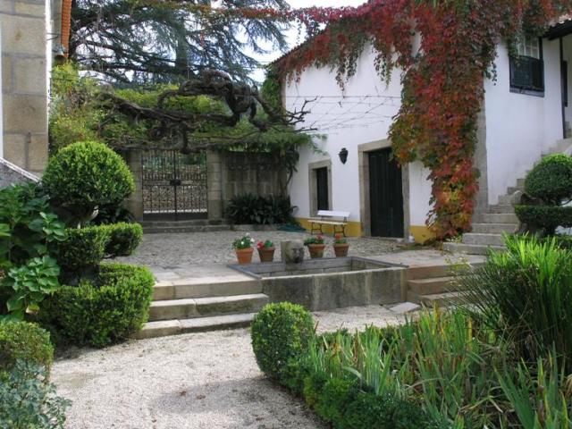 A chegada à casa faz-se a partir de uma estrada entre muros. Junto ao portão, a presença de um grande cedro marca um recanto aprazível para a leitura, facilitada pela presença de um banco revestido com fragmentos cerâmicos e conchas. Do portão passa-se para um pátio empedrado, marcado pela presença de um pequeno tanque e carranca em granito. Daqui acede-se a um patamar inferior com jardins formais de buxo, sendo de destacar duas unidades principais: um jardim de buxo dividido por dois eixos ortogonais, cujo centro é marcado por uma taça em granito lavrado, e outro jardim de buxo, de organização idêntica, mas cujo elemento central é um relógio de sol rodeado por quatro pirâmides em buxo talhado. Actualmente os canteiros destes jardins organizam-se por espécies, aromas e cores onde dominam o roxo e o branco dos agapantos e o cor-de-laranja das estrelícias. No conjunto da vegetação, encontram-se espécies arbóreas como áceres, cedros, magnólias, carvalhos, canforeiras, chorões, olaias e uma tília, que se destaca pelo seu grande porte, para além de fruteiras, como laranjeiras e pessegueiros. Outras espécies arbustivas e herbáceas, como camélias, hortênsias, glicínias, lírios, canas da Índia, madressilvas, contribuem para adicionar diversidade e colorido ao espaço. A quantidade e a disposição aleatória das espécies dentro dos canteiros de buxo, dificulta a leitura do espaço e do seu carácter geométrico. O jardim é também pontuado por vários elementos decorativos destacando-se um conjunto de bancos revestidos com fragmentos de cerâmicas, profusamente coloridas, sem contudo ter um relação fundamental com a estrutura do jardim. No limite sul do jardim de buxo de maiores dimensões encontra-se um pequeno nicho dedicado à devoção a Santo António.