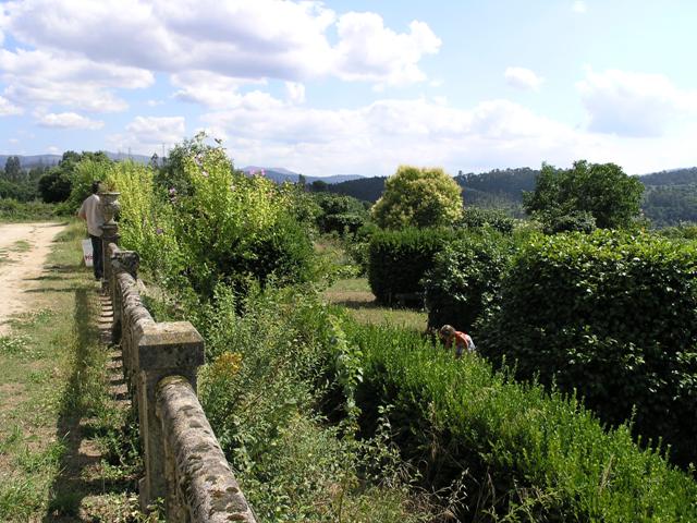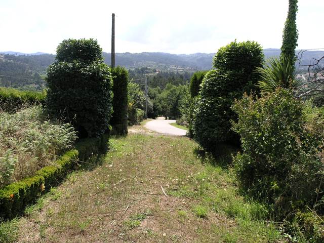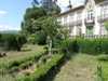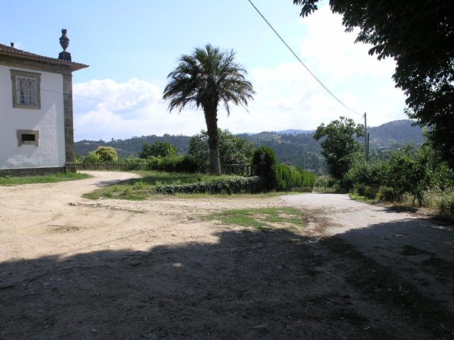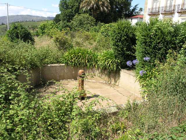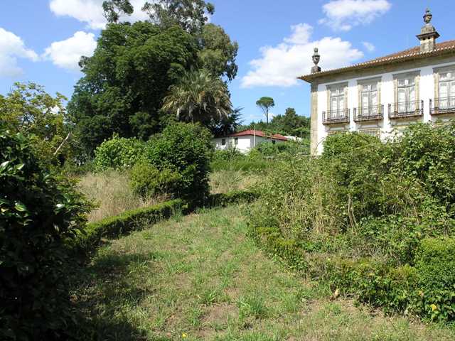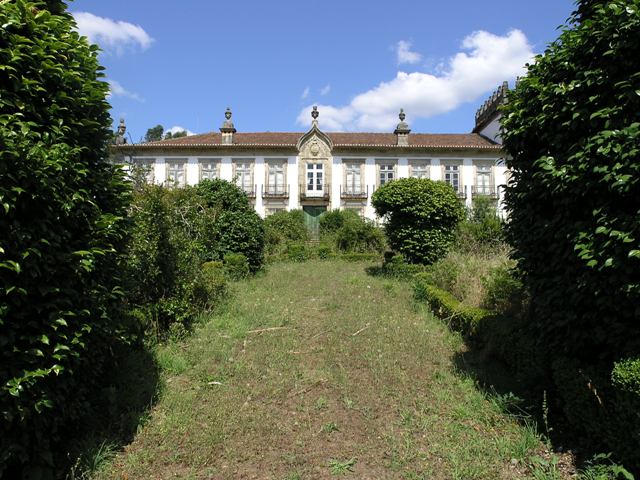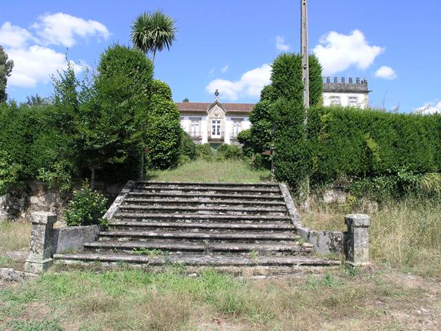 Frente à fachada principal, num patamar inferior delimitado por balaustrada de pedra interrompida pela escadaria de acesso, encontra-se o jardim de topiária característico dos jardins de Basto.