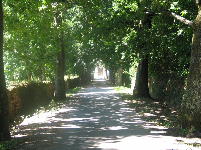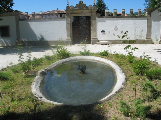 Antes de se entrar na Casa de Pielas, percorre-se uma alameda de plátanos com aproximadamente 100 metros, que orienta o olhar e o percurso para a área de recepção da casa. Chegando a este espaço, é possível observar-se o portão principal, integrado numa frente trabalhada em granito, que enquadra ao mesmo tempo a área de recepção, revestida a gravilha, com um pequeno lago redondo e repuxo em ferro no seu ponto central. O lago está inserido num canteiro de forma circular, delimitado por pequenas pedras irregulares em granito, e a planta que se destaca no seu interior é a roseira.